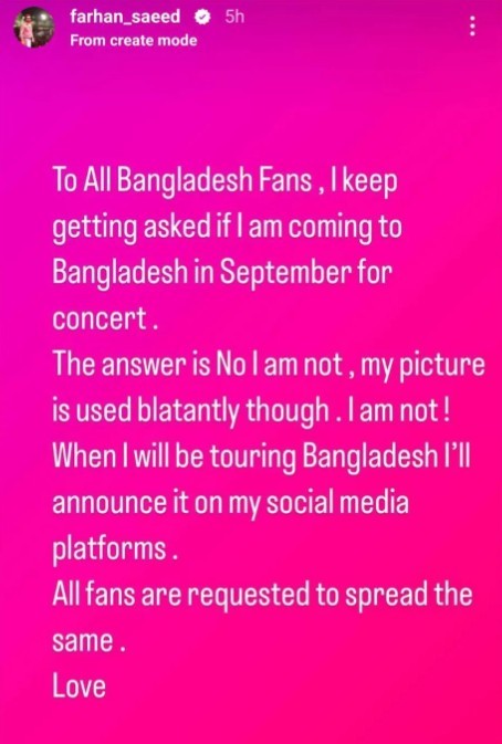 Previously, Farhan Saeed, the former lead vocalist of Jal, clarified on Instagram that he would not be performing in Bangladesh.