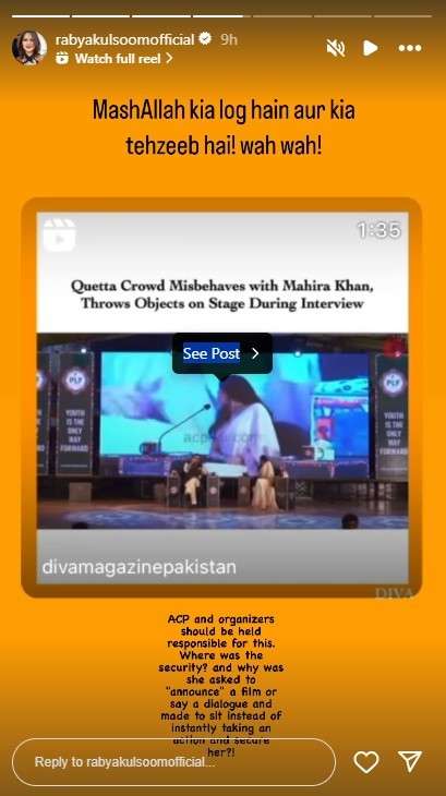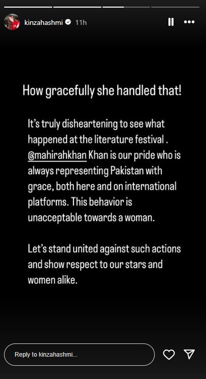 Actress Kinza Hashmi took to her Instagram story to condemn the crowd's “unacceptable” behaviour towards Mahira Khan.