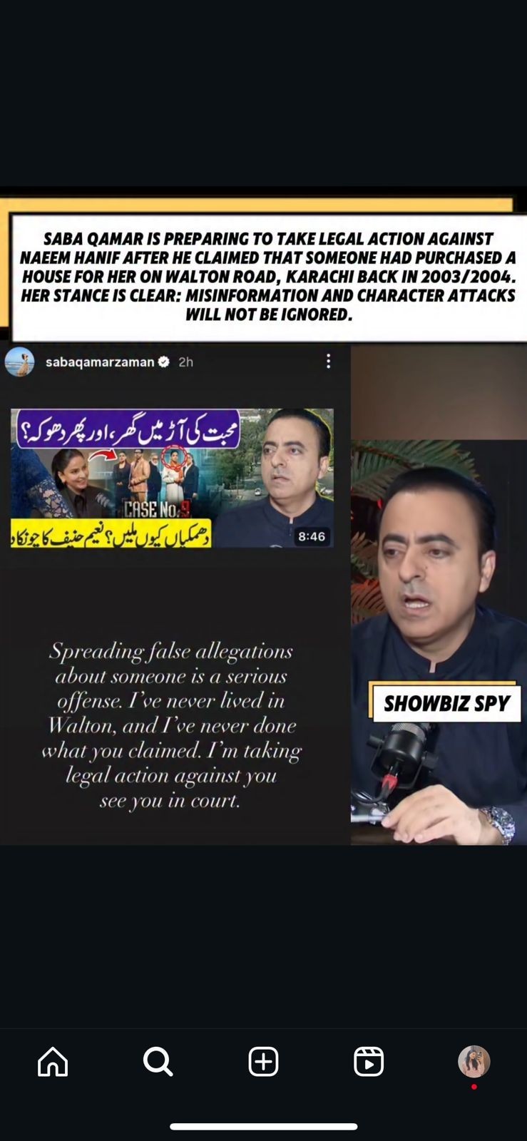 Journalist Naeem Hanif faced a strong response from Lollywood star Saba Qamar after he alleged that she had been gifted a home in Lahore by a man. Reacting firmly, the actress dismissed his claims as false, stating, 'See you in court.'
