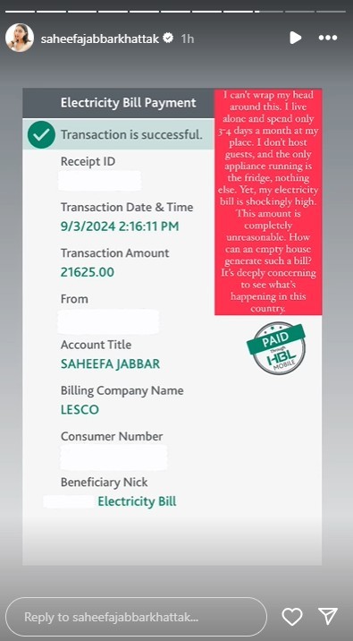 Taking to Instagram the actress shared a screenshot of her online payment receipt for her electricity bill. The bill, amounting to Rs21,625 left her astonished.