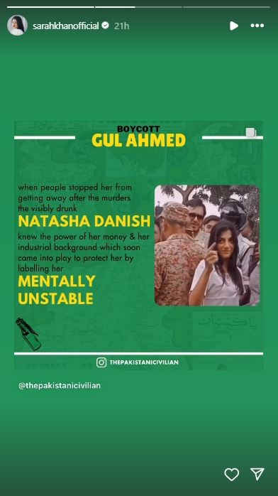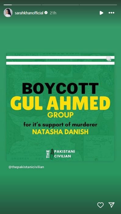 Pakistani actress Sarah Khan has taken to social media to urge her followers to boycott Gul Ahmed, a prominent textile company, following a fatal car accident involving Natasha Danish Iqbal, the alleged daughter-in-law of the company's owners.