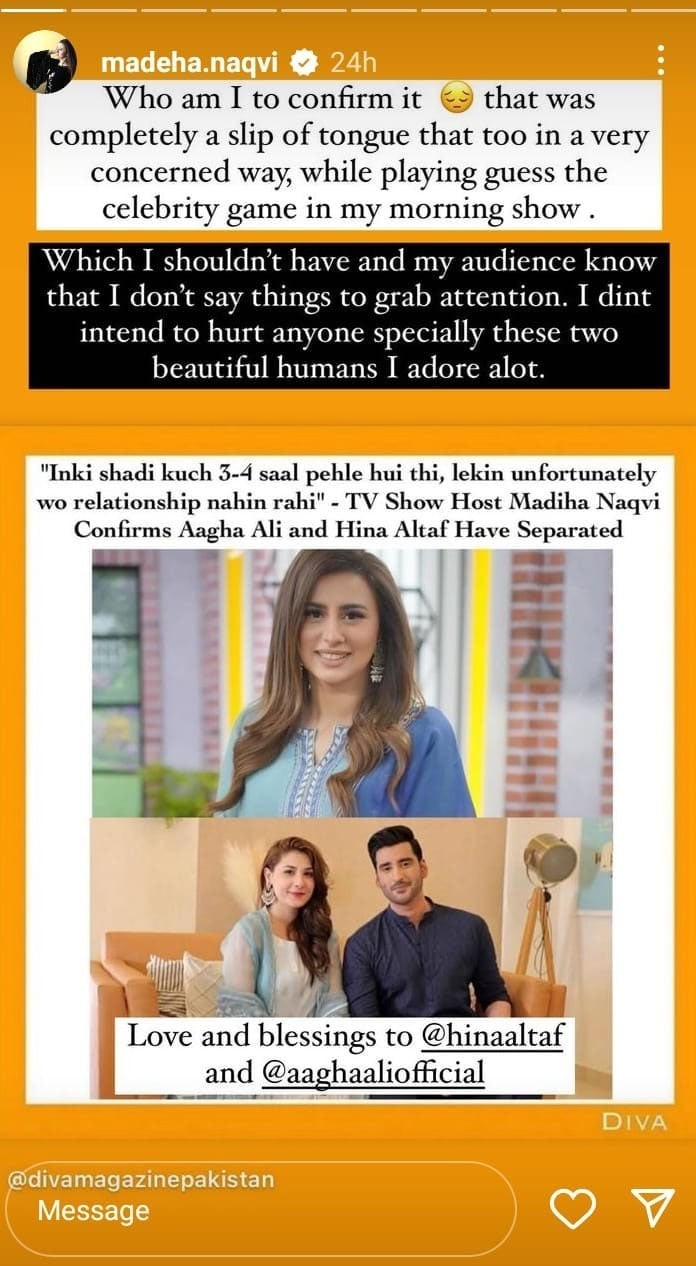 TV host Madiha Naqvi has retracted her statement about the divorce of celebrity couple Agha Ali and Hina Altaf, saying it was "completely a slip of tongue".