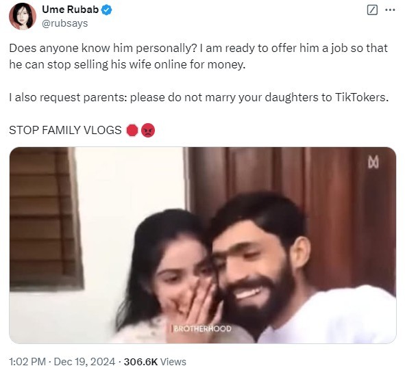 One X user vehemently criticiz=sed the vlogger, saying, “I also request parents: please do not marry your daughters to TikTokers.”