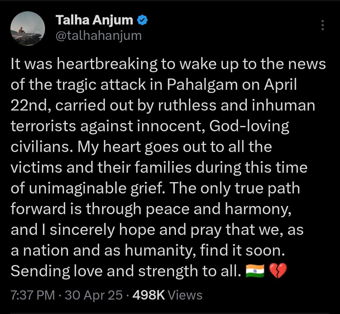 Talha Anjum condemns Pahalgam attack, calls for peace between Pakistan and India