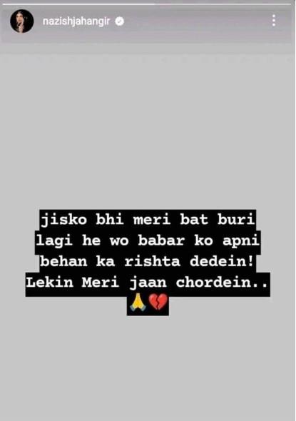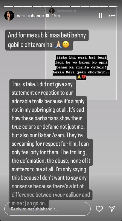 She took to her Instagram story and clarified, “This is fake. I did not give any statement or reaction to our adorable trolls. It is simply not in my upbringing at all. It is sad how these barbarians show their true colors or defame not just me but also our Babar Azam. They are screaming for respect for him, I can only feel pity for them."