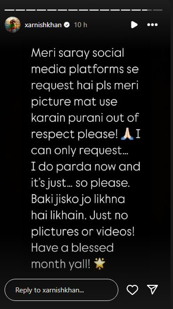 Former actress Zarnish Khan requested news platforms on social media to stop sharing her old pictures, as she has embraced 'purdah.'