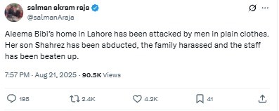 In a post on X, Raja alleged that Aleema Khan’s son, Shahrez, was abducted by men in plain clothes during the incident.
