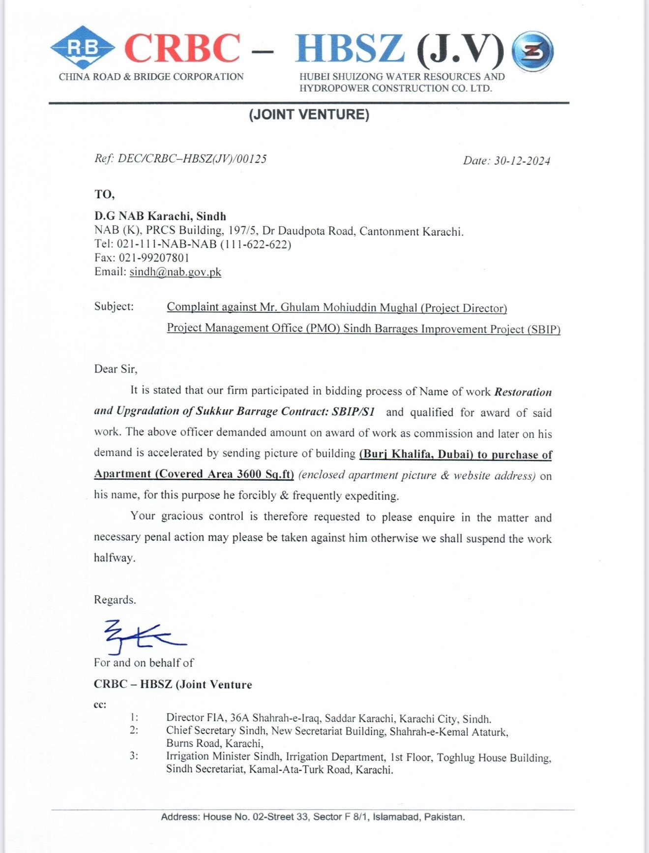 A Chinese company has accused Ghulam Mohiuddin Mughal, the director of the Sindh Barrages Improvement Project, of making exorbitant demands for money and property as a "commission" to approve a contract for the corporation.