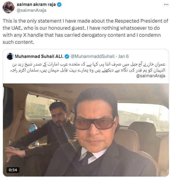 Taking to X (formerly Twitter), Salman Akram Raja shared a video in which he conveyed Imran Khan's message regarding the Emirati President's visit to Pakistan.