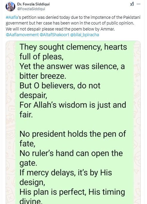 Taking to X, Dr Fowzia wrote, "Aafia's petition was denied today due to the impotence of the Pakistani government, but her case has been won in the court of public opinion."