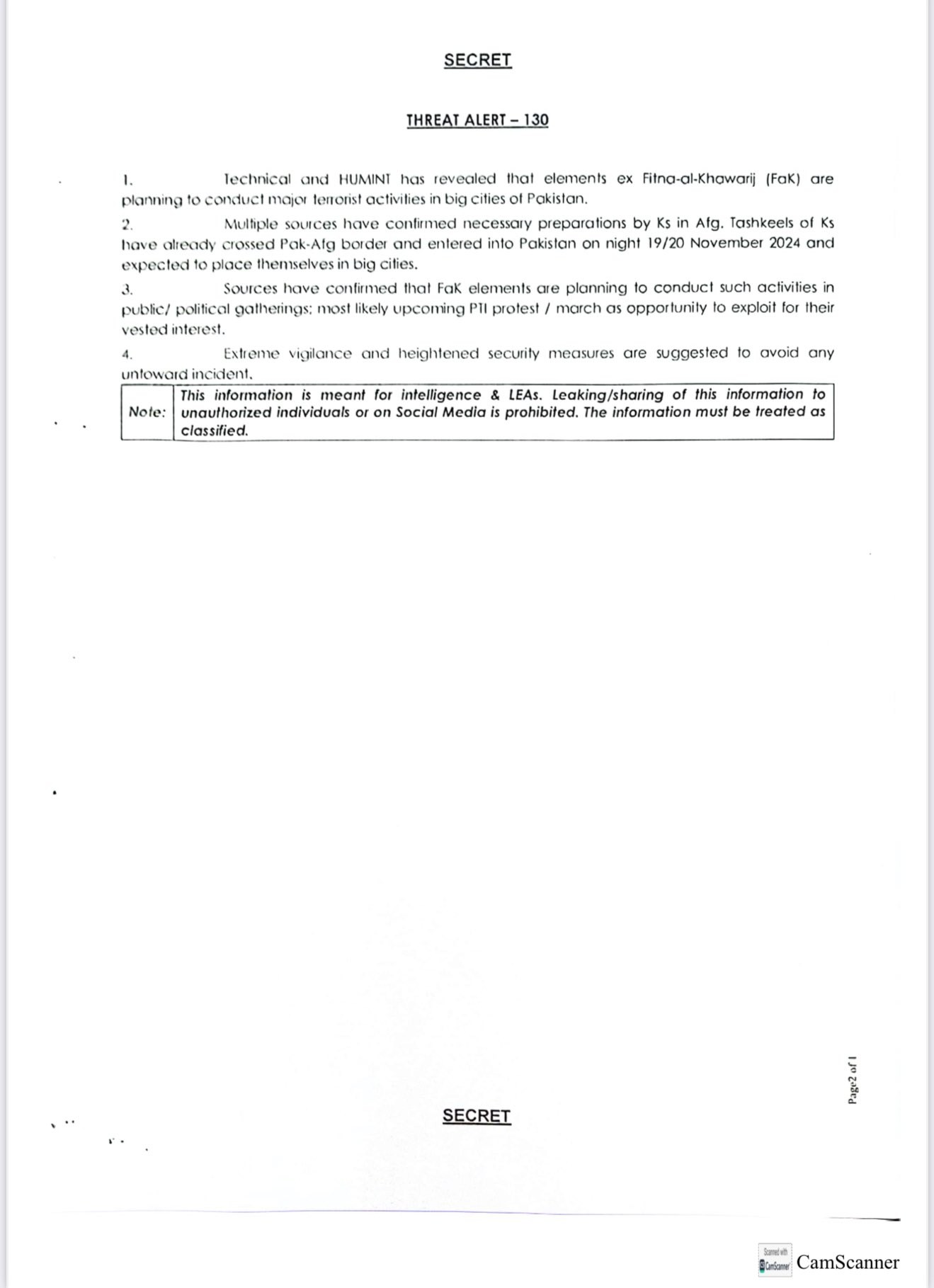 The National Counter-Terrorism Authority (NACTA) has issued a terror alert ahead of the Pakistan Tehreek-e-Insaf (PTI) protest scheduled for November 24, warning of potential threats from Fitnah-ul-Khawarij terrorist groups.