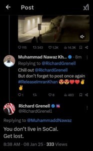 In response, Grenell angrily told the Pakistani user demanding Imran Khan’s release: “You don’t live in Southern California, so get lost.” After Grenell’s reply, the user deleted their post demanding Imran Khan’s release.
