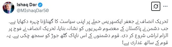 Taking to X, Ishaq Dar stated, "PTI has revealed the ugly face of its politics in the wake of the Jaffar Express attack. While the enemy targeted innocent Pakistani citizens, PTI blamed the army. The nation now sees through this unholy nexus of enemies. This is treason!"