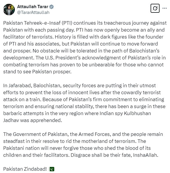 Meanwhile, Ataullah Tarar labeled PTI as "facilitators of terrorists," accusing the party of "derailing the country’s interests." He also emphasizsd that the United States has acknowledged Pakistan’s counter-terrorism efforts, highlighting the army’s relentless work to prevent further loss of innocent lives after the cowardly attack on the train.