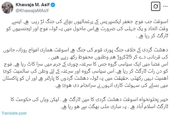 "The war against terrorism is a war of the entire nation. Our forces are sacrificing their lives daily to protect 250 million Pakistanis. In this environment, a political group, whose leader is serving a sentence for theft, is relentlessly targeting the army," he wrote on X.