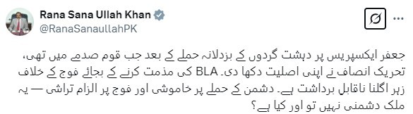 "PTI’s hate speech against the army amid the Jaffar Express attack is nothing short of treachery. While remaining silent on terrorism, they are shamelessly targeting our armed forces."