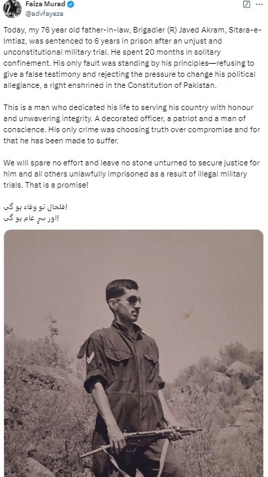 “Today, my 76-year-old father-in-law, Brigadier (retd) Javed Akram, Sitara-e-Imtiaz, was sentenced to six years in prison after an unjust and unconstitutional military trial,” her post read.