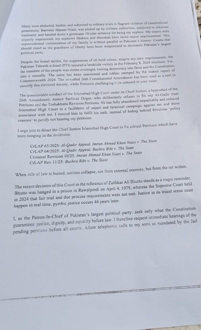 Imran also wrote about the allegedly “questionable conduct of the Islamabad High Court under its chief justice, a byproduct of the 26th Amendment; Justice Sarfaraz Dogar, who deliberately refuses to fix my Al-Qadir trust petitions and the Toshakhana revision petitions”.