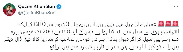 “ImranKhan is not in jail. He has been locked up in a very small cell at GHQ for the past 3 days, guarded by around 150 to 200 soldiers. A wall has been built in front of the cell. During the day, they put a black cloth on Khan's face and at night, they take off the cloth. He is under the worst torture,” he quoted anonymous sources as saying.