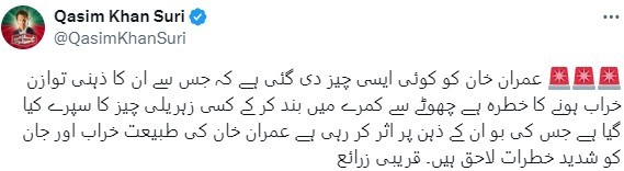 “Imran Khan has been exposed to a substance that threatens to destabilize his mental health. He is being held in a cramped room, where a poisonous substance is being sprayed, and its fumes are affecting his mind. Imran Khan’s health is rapidly deteriorating, and his life is in grave danger,” Qasim Suri’s post read, citing sources close to him.
