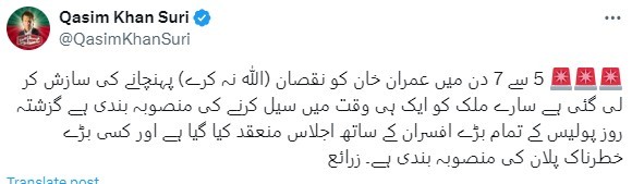 He expressed concern that an assassination plot against Imran Khan is in progress and could materialise within the next five to seven days.