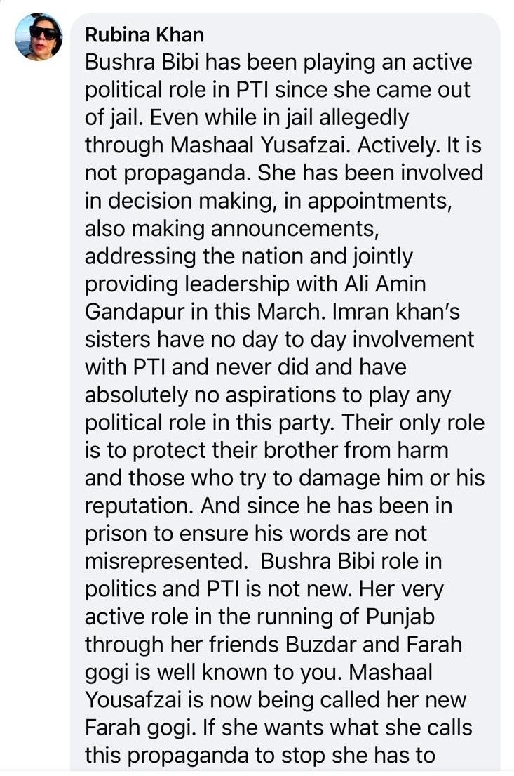 “Bushra Bibi has been playing an active role in PTI since she came out of jail,” Rubina Khan wrote in her comment, further alleging that Imran Khan’s wife wielded influence even while incarcerated through her spokesperson, Mashal Yousafzai.