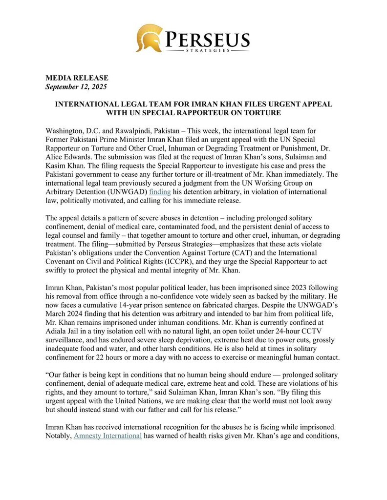 The international legal team of former Pakistani Prime Minister Imran Khan has lodged an urgent appeal with the UN Special Rapporteur on Torture and Other Cruel, Inhuman or Degrading Treatment, Alice Edwards, seeking an immediate investigation into the treatment of the jailed opposition leader.