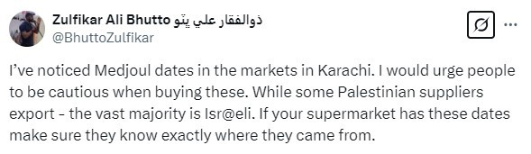 Taking to X, Zulfikar Ali Bhutto Jr urged people to verify the brand and country of origin before purchasing dates to avoid inadvertently buying Israeli products.