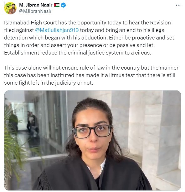 Lawyer and activist Jibran Nasir called on the Islamabad High Court (IHC) to declare the arrest of senior journalist Matiullah Jan illegal as lawyer, Imaan Mazari, filed a criminal revision petition, requesting it be heard today (Friday).