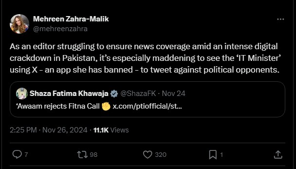 A senior journalist, Mehreen Zahra Malik, shared her difficulties with X handle, highlighting “an intense digital crackdown in Pakistan”.