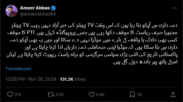 Ameer Abbas claimed that TV channels were doing state-infleunced narrative. “The media cannot air PTI's account on any accident or incident.