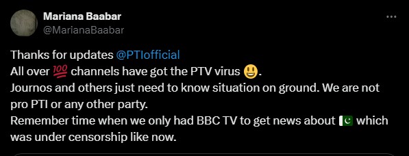 Marina Baabar praised PTI's official page for timely updates, which the media and news channels are unable to provide.