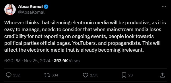Senior journalist Absa Komal underscored the consequences of silencing electronic media as she argued that “when mainstream media loses credibility for not reporting on ongoing events, people look towards political parties' official pages...”