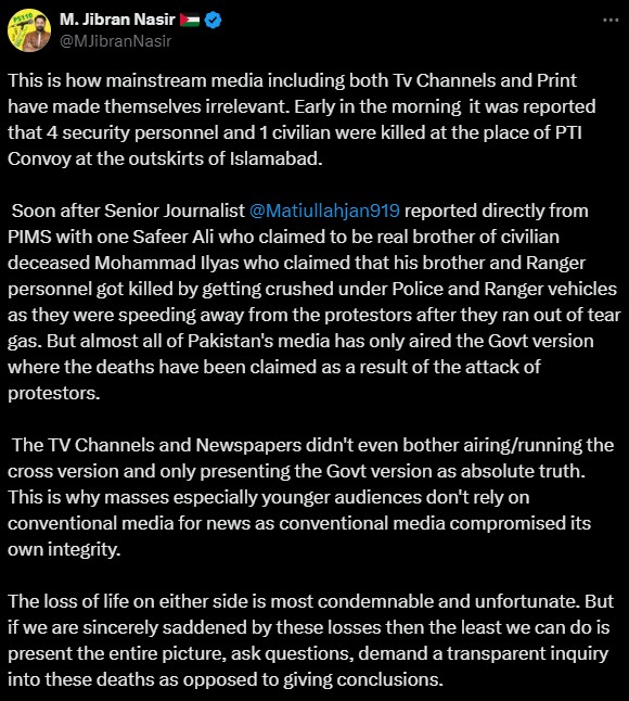 Lawyer and activist Jibran Nasir lashed out at the media organisations for failing to report crucial incidents, including the death of Rangers personnel, impartially. He stated that the conventional media "compromised its own integrity."