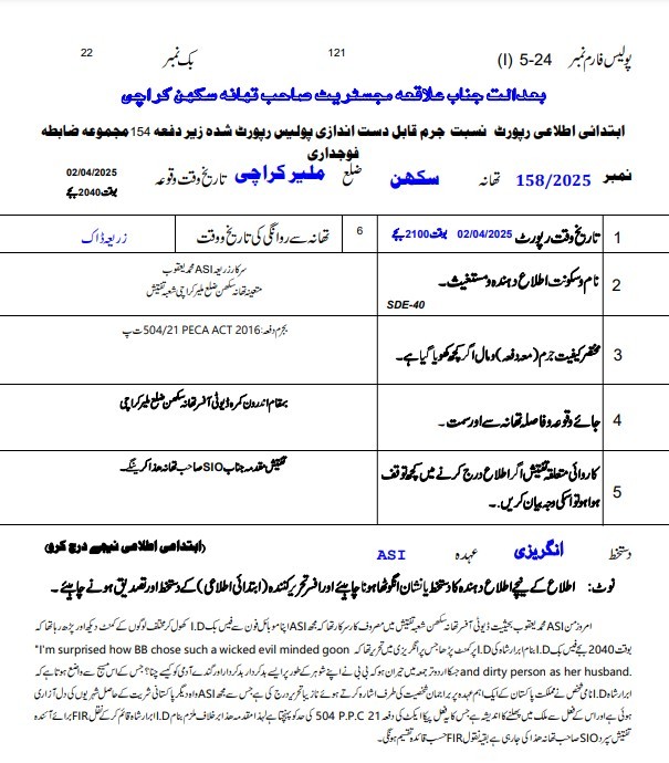 The case was registered on the complaint of duty officer ASI Muhammad Yaqoob in Karachi’s Sukkun police station, under Section 504 of the Prevention Electronic Crime Act (PECA), 2016, stating that Station Investigation Officer (SIO) Abrar Shah’s comment on social media prompted him to take legal action.