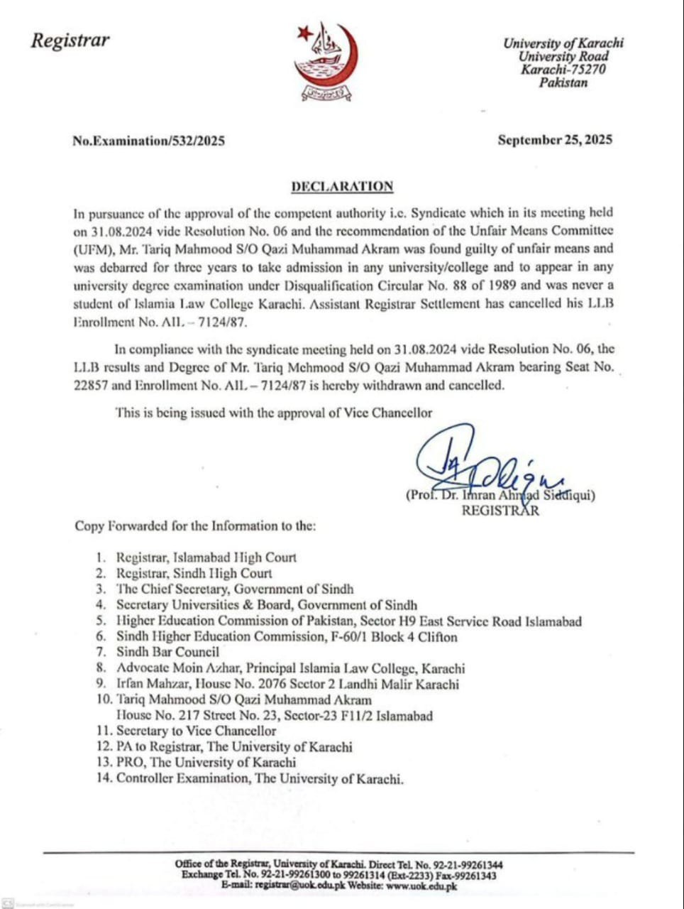 KARACHI: The University of Karachi has annulled the LLB degree of Justice Tariq Mehmood Jahangiri of the Islamabad High Court, citing misconduct and use of unfair means.