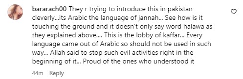 “They are trying to introduce this in Pakistan cleverly...its Arabic, the language of jannah...See how is it touching the ground and it doesn't only say word halawa as they explained above....This is the lobby of kaffar [infidels]... Every language came out of Arabic, should not be used in such a way... Allah said to stop such evil activities right in the beginning of it... Proud of the ones who understood it,” a comment read on the post.