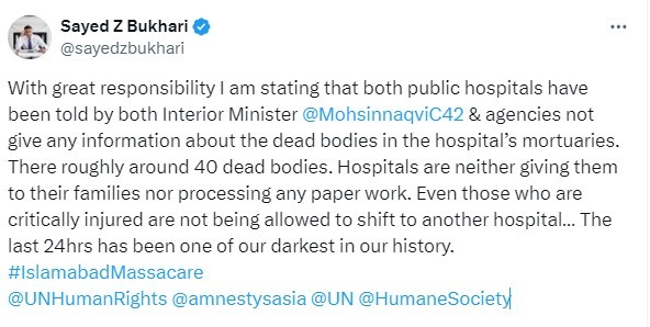 These hospitals, Bukhair said, “have been told by both Interior Minister Mohsin Naqvi & agencies not to give any information about the dead bodies in the hospital’s mortuaries. There are roughly around 40 dead bodies.”
