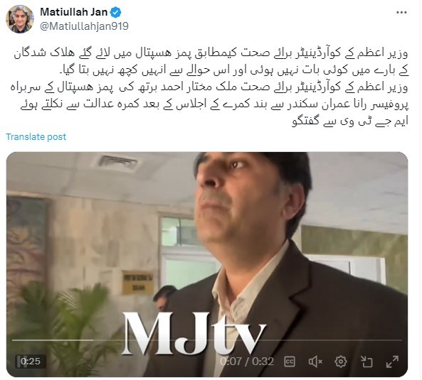 Journalist Matiullah Jan also interviewed Dr Mukhtar Ahmad, Coordinator on Health at PIMS Hospital, about the dead bodies of PTI workers. However, Dr Ahmad expressed his unawareness of the matter.