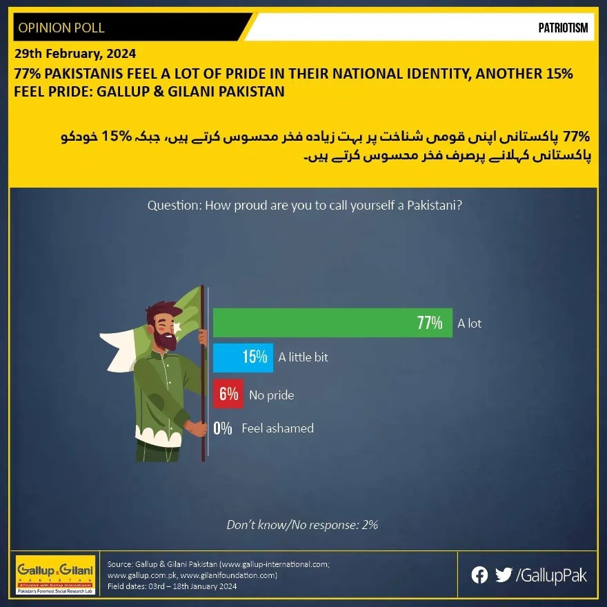 In response, almost 77 percent Pakistanis replied that they feel 'a lot of pride' in their national identity, while 15 percent said their nationality makes them 'a little bit' proud.