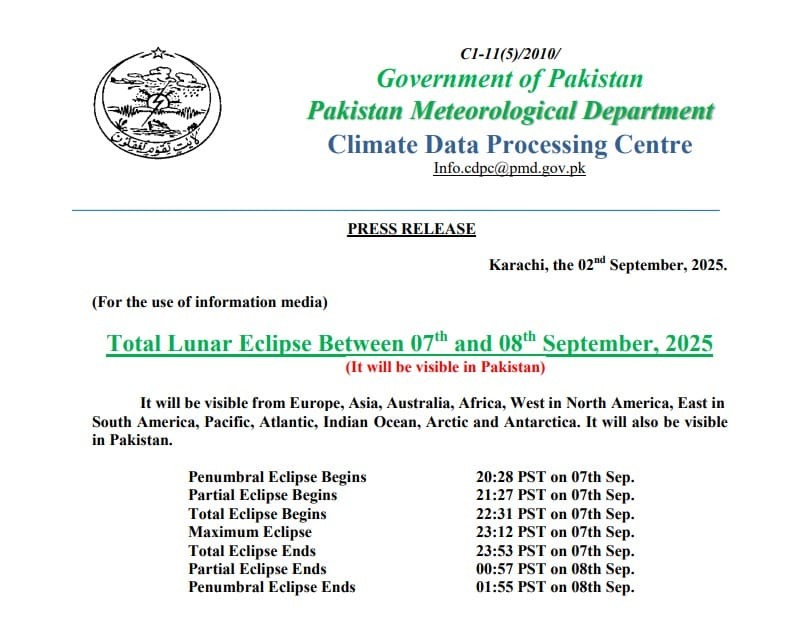 KARACHI: Skywatchers across Pakistan are set to witness a spectacular “Blood Moon” during a total lunar eclipse on the night between September 7 and 8, the Pakistan Meteorological Department (PMD) announced.