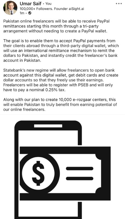 “The goal is to enable them to accept PayPal payments from their clients abroad through a third-party digital wallet, which will use an international remittance mechanism to remit the dollars to Pakistan, and instantly credit the freelancer’s bank account in Pakistan,” he said in a social media post.