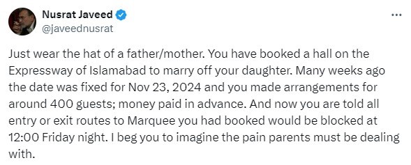 Journalist Nusrat Javed highlighted the plight of a citizen who had booked a wedding marquee located in one of the blocked areas, leaving the family in distress.