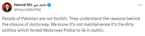 “People of Pakistan are not foolish. They understand the reasons behind the closure of motorway. We know it’s not maintainance it’s the dirty politics which forced Motorway Police to lie in public,” said journalist Hamid Mir.