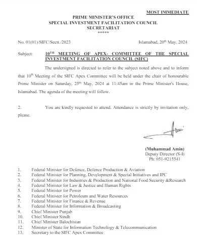 Prime Minister Shehbaz Sharif has convened a meeting of the Pakistan Army-backed investment body Special Investment Facilitation Council (SIFC) on Saturday (May 25).