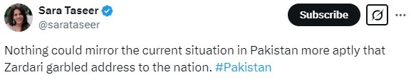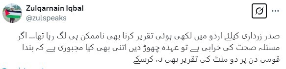 While the content of President Zardari’s speech touched upon all key aspects of a Pakistan Day address, many viewers pointed out that he struggled with its delivery. He frequently fumbled over words and appeared to have difficulty reading the speech clearly.