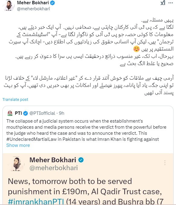 Meher Bokhari, however, responded to PTI’s criticism, asserting that the party expects journalists to act as its spokespersons and promote its narrative.
