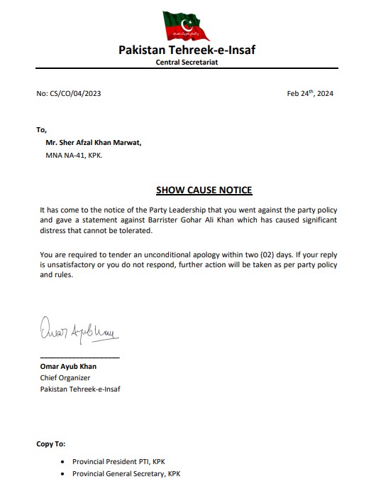 Pakistan Tehreek-e-Insaf (PTI) has issued a show cause notice to its seniour vice-president Sher Afzal Khan Marwat after the latter gave a statement against party acting chairman Barrister Gohar Ali Khan on a private news channel.