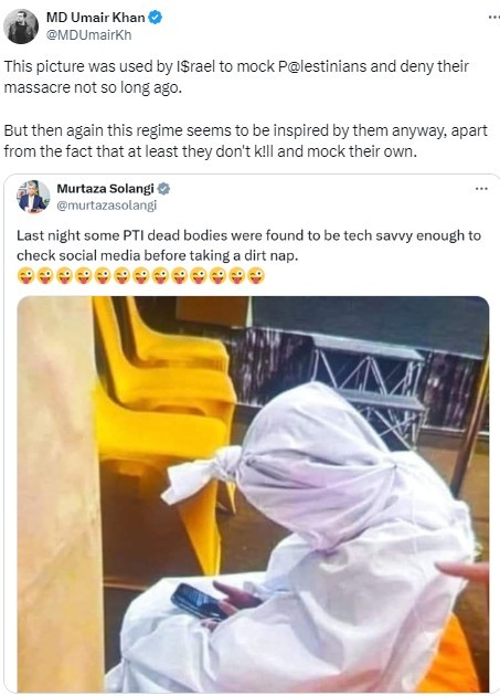 Imran Khan’s supporters further stated that the image used by Solangi to mock deceased PTI workers was originally shared by an Israeli account on X to ridicule the deaths of Palestinians in Gaza.