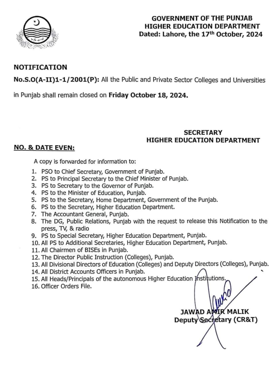 The Punjab government has announced a holiday for all private and public universities and colleges across the province on Friday, according to an official notification issued here.